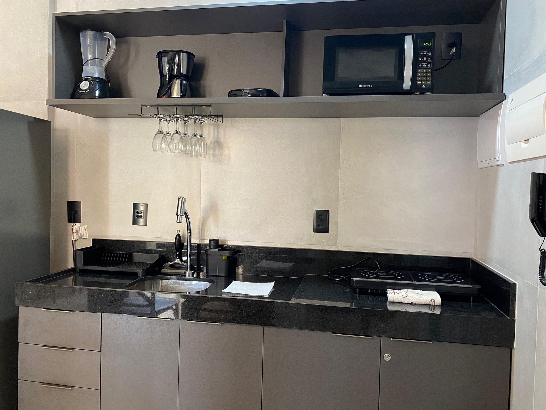 - Cozinha e Eletroportáteis: Frigobar, sanduicheira, fogão elétrico, cafeteira elétrica, liquidificador, micro-ondas.
